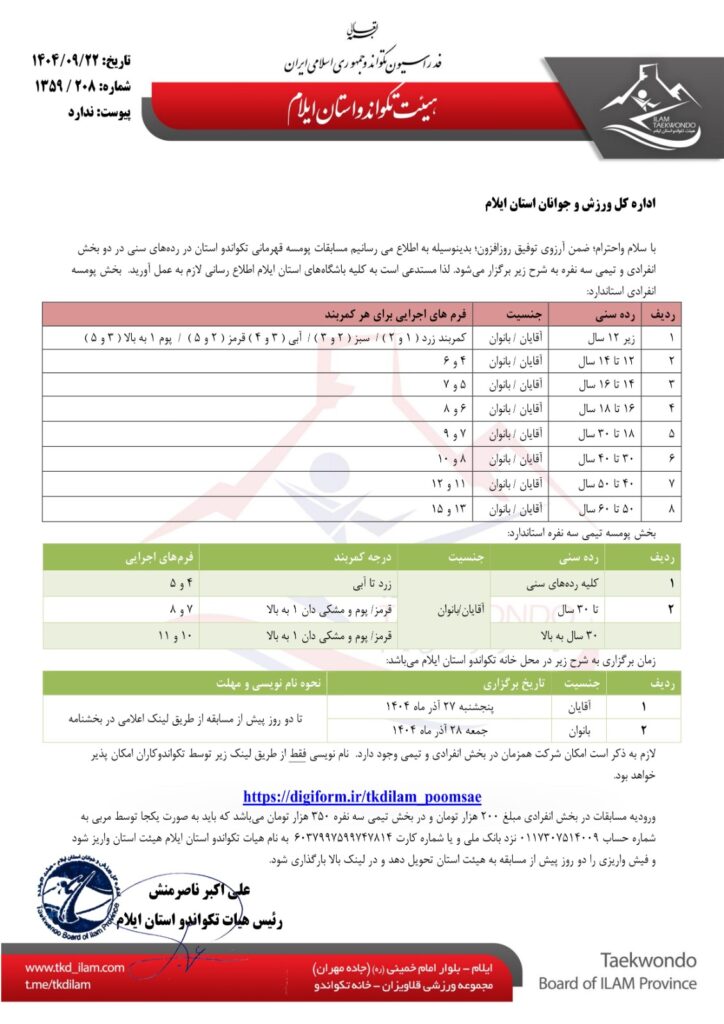 اطلاعیه برگزاری مسابقات پومسه قهرمانی استان ایلام مورخ ۲۷ و ۲۸ آذر ماه ۱۴۰۴