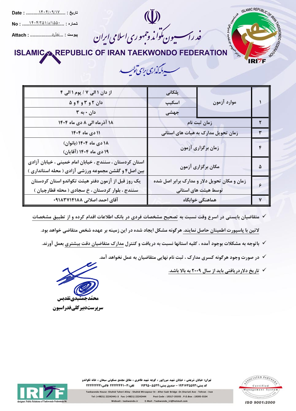 - تحویل مدارک: زمان و مکان تحویل دلار و مدارک برابر اصل شده توسط هیئتهای استانی، یک روز قبل از آزمون در دفتر هیئت تکواندو استان کردستان واقع در سنندج، بلوار کردستان، خیابان سجادی (محله قطارچیان) میباشد.
